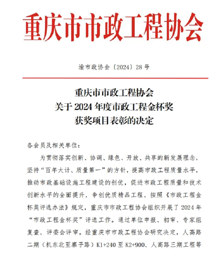 喜报|公司重庆曾家岩项目荣获“2024年度重庆市市政工程金杯奖”